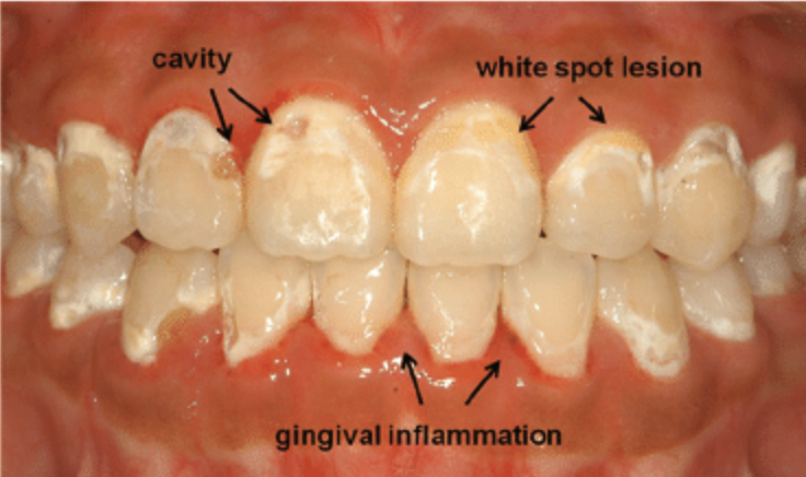 • Early tooth decay is usually identified by white spots (which can’t be removed with brushing) signaling that the enamel is starting to break down which can progress to brown spots on teeth